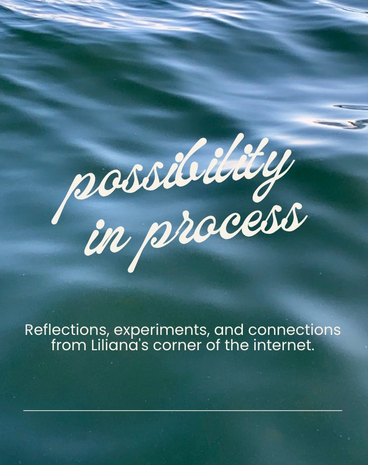Possibility in Process is a newsletter from me to you, to share my reflections, experiments, and connections from my corner of the internet. Possibility in process is returning to the “forever questions” of life — and there is something in my own process that wants to be witnessed here.